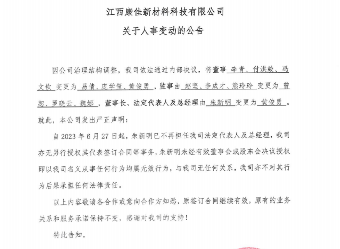 因公司治理結構調整,我司依法通過內部決議,將董事李青、付洪蛟、馮文欽變更為易倩、龐學璽、黃俊勇,監事由趙堅、李成才、熊玲玲變更為曾 恕、羅曉云、魏娜,董事長、法定代表人及總經理由朱新明變更為黃俊勇。就此,本公司發出嚴正聲明:自2023年6月27日起,朱新明已不再擔任我司法定代表人及總經理,我司亦無另行授權其...
